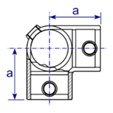 90° corner joint, often used on middle rail on level sites and often paired with type 128. The through tube (vertical in photo) cannot be joined within the fitting.